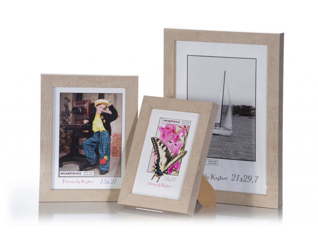Dodáváme včetně skla, opěrné nožičky a závěsu pro pověšení. Rámeček lze postavit a pověsit jak na výšku, tak i na šířku.